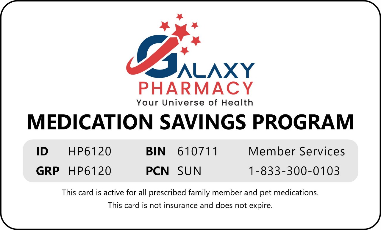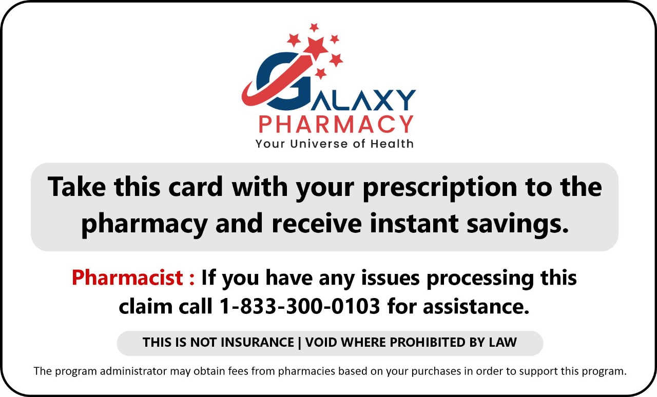 The Galaxy Pharmacy medication savings program provides discounts of up to 87% off retail prices at all major chains and most independent pharmacies nationwide.